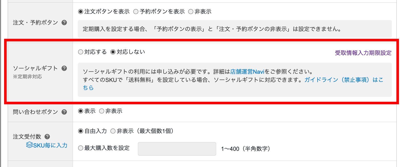 「販売・価格」タブに「ソーシャルギフト」(商品単位)が追加されるので「対応する」を選ぶ。